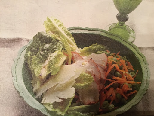 Healthy and simple salad of Romain lettuce, green beans, carrots, turkey and manchego cheese.