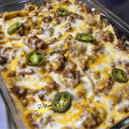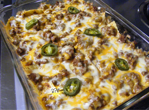 Layer half the broken shells on the bottom of the baking dish; cover with half of the meat mixture, then 1 cup of cheese on top. Repeat layers with the remaining ingredients (shells, meat, cheese). Top with sliced jalapenos or black olives, if desired.