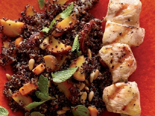 Mound the quinoa salad on plates. Garnish with the toasted pine nuts and mint leaves and serve the chicken skewers alongside.