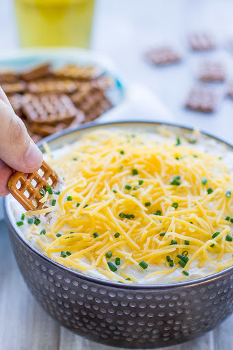 Garnish with some fresh chives and serve with pretzels and pita chips.