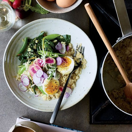 Divide the warm quinoa among bowls. Arrange the greens, snap peas and eggs on top. Drizzle each bowl with the dressing, sprinkle with cheese, pepper and radishes and serve.
