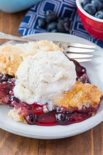 Bake for 30-40 minutes until the fruit starts to bubble up around the edges and the edges start to turn golden. I baked mine in a casserole dish that was deeper than a 9×13” pan so it took 40 minutes. Different pans will have different baking times, so start checking after 30 minutes.