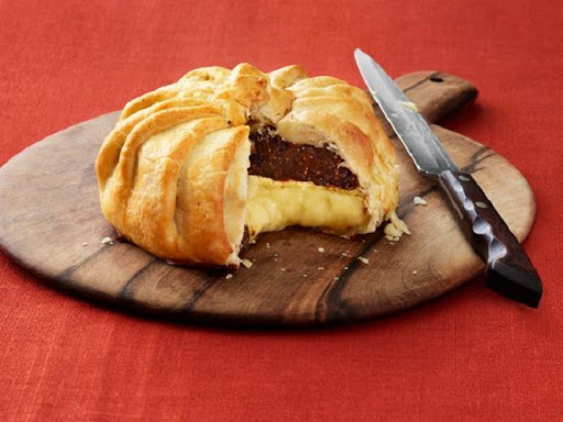Transfer the wrapped cheese to a parchment-lined baking sheet. Brush the dough with the beaten egg and bake until golden brown, 30 to 35 minutes. Let cool about 10 minutes, then transfer to a cutting board to slice. Serve warm or at room temperature.