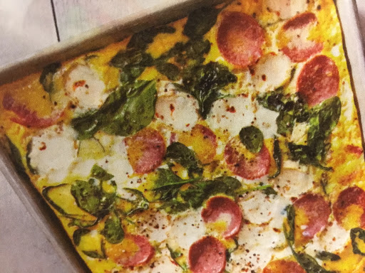 Preheat oven to 400. Light coat rimmed baking sheet with spray, line with parchment and spray again. Scatter spinach, bocconcini and salami evenly over sheet.