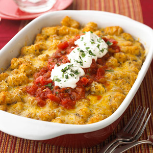 1.Preheat oven to 375 degrees F. Lightly coat a 3-quart rectangular baking dish with nonstick cooking spray. Arrange potato nuggets in dish.