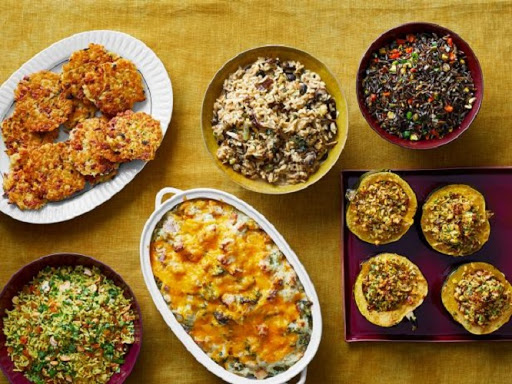 24. Brown Rice–Stuffed Acorn Squash Combine 1 cup cooked brown rice with 1/2 cup each chopped celery, parsley, scallions and cooked chestnuts; season with salt. Halve and seed 2 small acorn squash; brush the insides with olive oil and season with salt. Transfer to a baking sheet and bake at 425 degrees F until tender, 35 to 40 minutes. Stuff with the rice mixture and dot with butter. Continue baking until crisp, 20 minutes.