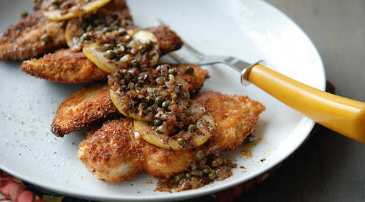 Add the shallots and capers to the skillet and cook, stirring, for 30 seconds. Stir in the lemon slices. Spoon some of the sauce over the butter fried chicken and serve with the remaining sauce on the side.