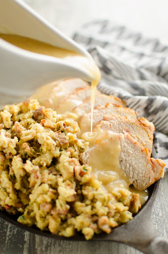 After the pork loin has rested, cut and serve with the gravy and stuffing.