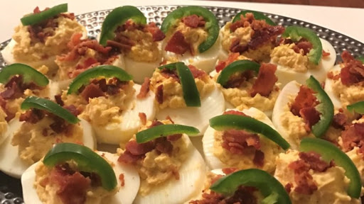"A spin on an old classic. Deviled eggs with the addition of savory bacon, delicious Cheddar and spicy jalapeno."