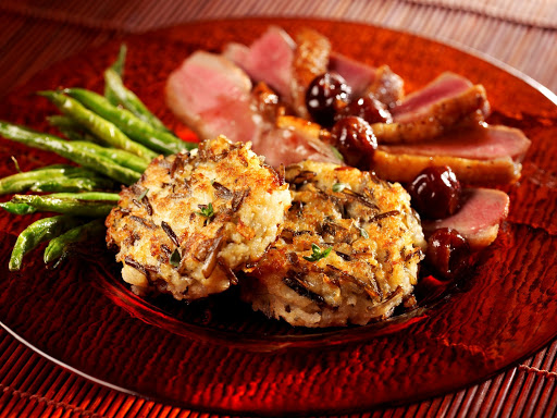 Heat remaining 1/4 cup olive oil over medium heat in a skillet large enough to hold the rice cakes. Add cakes and cook until golden brown on both sides, about 6 minutes total. Serve immediately or keep warm on a baking sheet in a 200° oven.