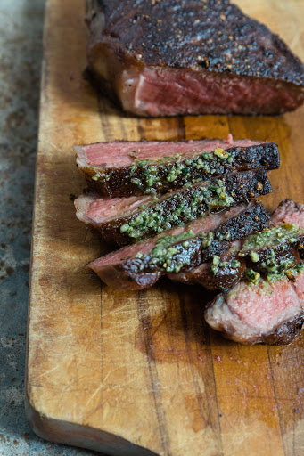 Seared Strip Steak with Almond-Rosemary Salsa Verde