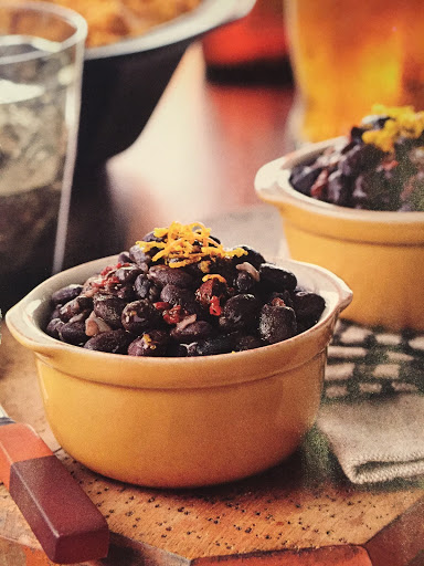 Sweat onion, garlic and coriander in oil in a saucepan over medium low heat, covered until onion softens, 5 minutes. Stir in beans, orange juice, chipotle, honey and zest; simmer until thickened 10 minutes. Stir in lime juice and season beans with salt.
