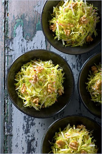 4. When ready to serve, gently squeeze water from apple, add to cabbage and toss slaw with vinaigrette. Add mustard seeds and toss again. Sprinkle walnuts on top of slaw. Season with salt and pepper.