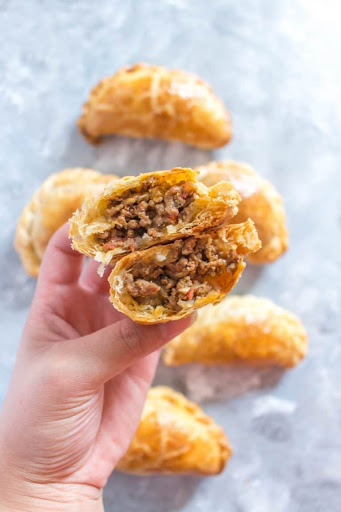 Place 1-2 tablespoons of the ground beef filling in the centre of the puff pastry and fold the circle in half. (Add more or less filling, depending on the size of your circles). Pinch and fold the edges to seal them.