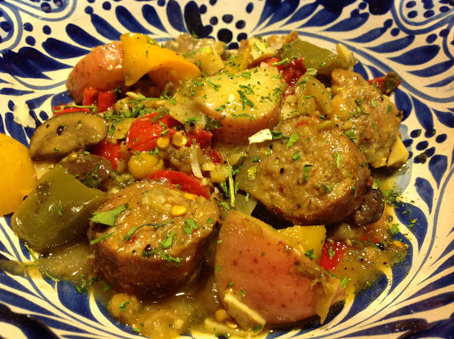 Add bells, garlic, mushrooms and potatoes, saute 5 minutes. Add the hot cherry peppers, basil, oregano and rosemary- stir and continue to saute.