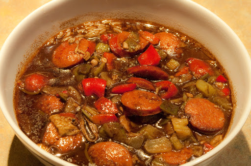 Next, heat the 2/3 cup of cooking oil over medium-high heat in a large (at least 8 quart) heavy bottomed Dutch Oven style post. Once oil is heated, stir in the flour, then keep stirring mixture to make a dark brown roux. This may take 20 minutes or so, but keep stirring until the dark brown color is achieved. It should give off a nutty scent. Then add the onions, bell pepper, celery and garlic. Sauté and stir occasionally until tender. During this sautéing, allow the vegetables to attach to the bottom of the pan, than scrape the bottom with a metal spoon or spatula. This will allow the natural sugars in the onions to caramelize, creating a depth of flavor.