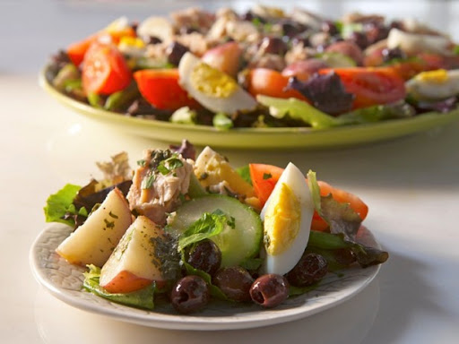 In large bowl, toss greens with half of vinaigrette. Place greens on large platter. Cut each potato in half or into quarters if large; transfer to platter with greens. Arrange beans, eggs, cucumber, tuna, tomatoes, and olives in separate piles on same platter; drizzle with remaining vinaigrette.