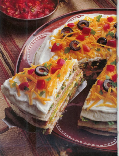Place one of the tortillas on a large platter. Spread with half of the avocado dip. Then top with a second tortilla. Spread with half of the refried beans. Cover with a third tortilla. Sprinkle with half of the chicken-lettuce mixture. Add a forth tortilla. Spread with half of the sour cream sprinkle with half of the cheese. Repeat layers, ending with sour cream and cheese. Garnish with tomatoes, olives, and cilantro. To serve, cut into wedges. If desired, serve with salsa.
