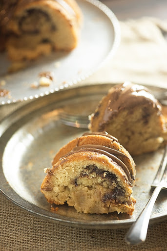 Pour half of the batter into the prepared bundt pan. Drop heaping spoonfuls of Nutella over the top of the batter, about 1/2 a cup.