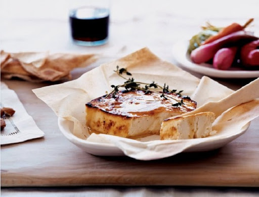 Preheat the oven to 400 degrees. Select a small oven-to-table earthenware dish or a small ovenproof sauté pan lined with aluminum foil to help transfer the cheese to a plate after roasting. Place the feta in the dish and cover with the olive oil. Bake until the cheese is soft and springy to the touch but not melted, about 8 minutes.