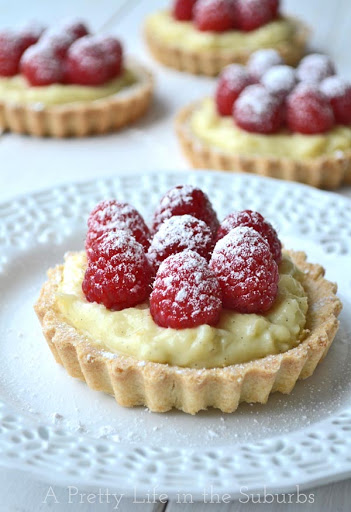 Fill the prepared tart shell with the cream and evenly distribute raspberries over the custard. Chill for 1 hour before serving to set the filling slightly.