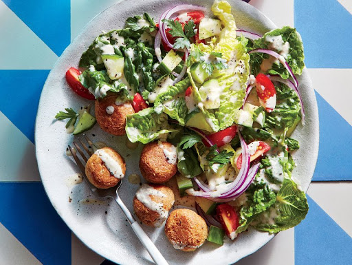 4. Heat a large nonstick skillet over medium-high. Add remaining 3 tablespoons oil; swirl to coat. Add chickpea balls to skillet. Cook, turning occasionally, until browned all over and crisp on the outside, 8 to 10 minutes. Serve chickpea balls with salad; drizzle with tahini dressing. Serve immediately.