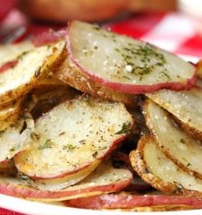 Next add the herbs and spices. Then add the olive oil. Mix all of the ingredients together so the olive oil and herbs evenly coat both sides of the sliced potatoes.