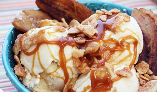 Peel the banana, slice it in half then slice lengthwise to make four quarters. Add Coconut Oil to a medium-sized pan on medium heat. Keep the heat just below the smoking point. Sprinkle Cinnamon over the Bananas then fry for 2-3 minutes on each side. Once finished, they should be well caramelized, but not mushy. Scoop Ice Cream into a dish, arrange fried Banana slices on the side and sprinkle generously with crushed Pita Chips, then finish with a drizzle of Caramel Sauce.