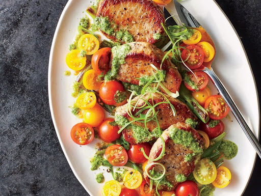 3. Heat a large skillet over medium-high heat. Sprinkle pork with 1/4 teaspoon salt and pepper. Add remaining 1 tablespoon oil to pan; swirl to coat. Add pork and 2-inch onion pieces; cover and cook 4 minutes. Turn pork over. Add tomatoes; cook 2 minutes. Sprinkle with remaining 1/8 teaspoon salt. Arrange pork mixture on a platter. Drizzle with sauce; sprinkle with slivered onions.