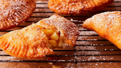 To make the dough, in a medium bowl, combine the flour and salt. Cut in the shortening with a long-tined fork. Add the milk and stir until the dough sticks together. Divide into 10 portions. Roll each portion out on a floured surface into a 5- or 6-inch circle. Place 2 tablespoons of filling in each. Wet the edges and fold over, crimping with a fork.