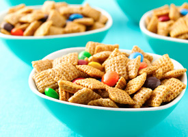 3. Microwave uncovered on High 5 to 6 minutes, stirring and scraping bowl after every minute, just until cereal begins to brown. Cool 5 minutes; stir in candies. Spread on waxed paper to cool; break into bite-size pieces. Store in airtight container.