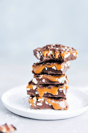 In another microwave safe bowl, combine the unwrapped soft caramels and heavy cream. Microwave in bursts of 20 seconds, stirring in between each burst for 10 seconds until the caramels and melted and smooth. Spread the caramel over the pecans.