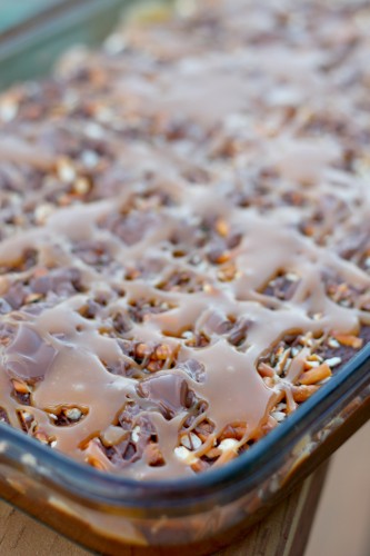 Combine the caramels and heavy cream in a small saucepan over low heat, stirring until smooth. Drizzle over the brownies and let rest for at least an hour before cutting into squares.