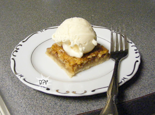 It's traditional pecan pie.. baked in a jellyroll pan and cut into bars. These have a lot less syrupy goo than traditional pecan pie. Serve with fresh whipped cream, Cool Whip, or vanilla ice cream.