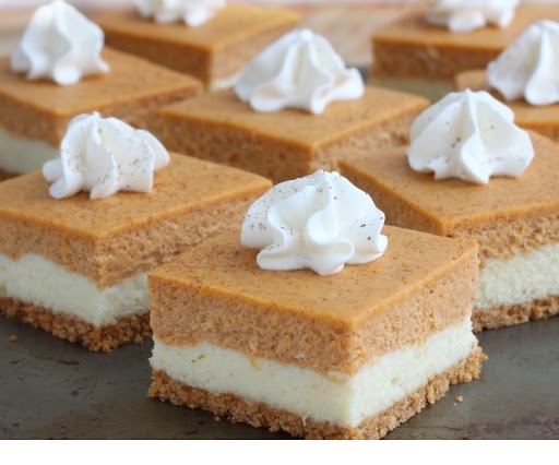 3. While the crust is baking, in a medium bowl, using an electric mixer, beat the cream cheese, 1 egg, 1/3 cup sweetener, and vanilla. When crust has cooled, gently spoon the mixture over the crust and smooth. Set aside. In the same bowl, beat the pumpkin, 1 egg, 1/2 cup sweetener, and spices until smooth. Gently spoon dollops of the filling onto the cream cheese mixture and smooth the layer.