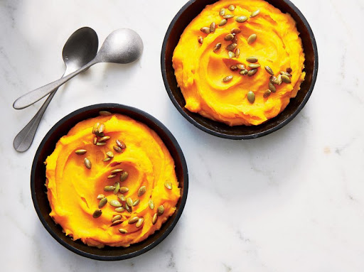Instead of sweet potatoes, try equally starchy, carotene-rich butternut squash for your next mash. A food processor will get the mixture silky smooth. You can also change the profile by swapping maple syrup and fresh ginger for a little ground cinnamon and curry powder or minced fresh sage and grated Parmesan cheese.