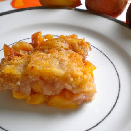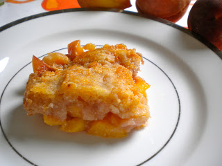 ~Place the diced peaches into the baking pan first, evenly spread out.