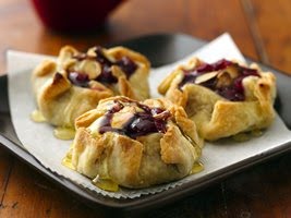 Gently press 1 heaping teaspoon almond paste in center of each crust round. Divide cranberry mixture evenly over almond paste. Fold 1/2 inch of each crust round over filling, pinching slightly so crust lays flat on cranberry mixture. Sprinkle each with almonds.