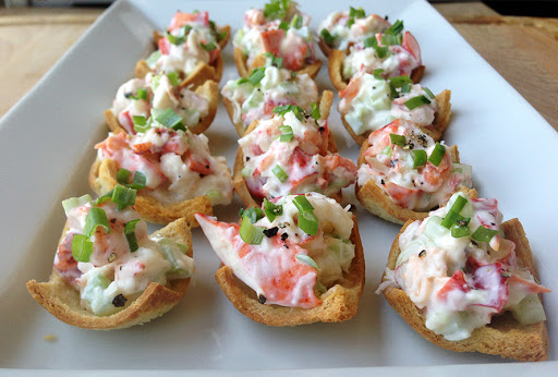 6. Spoon the salad into the toast cups just before serving. Sprinkle with dark green part of green onion.