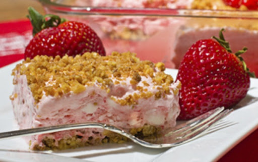 Beat sliced strawberries, egg whites, sugar and lemon juice on high speed for 10 minutes. Set aside. Whip heavy cream, then fold into strawberry mixture. Pour strawberry mixture over crumbs then sprinkle the rest of the crumbs on top. Cover and freeze until set.