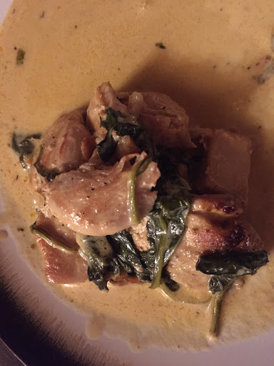 400 F. Season chicken with paprika, salt and pepper. Brown chicken in 2 Tbsp melted butter. Put chicken in casserole. Melt rest of butter and sauté garlic. Stir in chicken broth, cream, Parmesan, lemon juice and thyme. Bring to boil, reduce heat add spinach and simmer until spinach wilts and sauce slightly thickens. Pour over chicken and bake for 30 minutes.