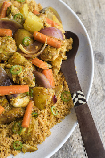 Tip: Don't worry about the couscous falling through the steamer basket holes. By the time it's in the basket it's already coated with oil and partially hydrated, which binds it together enough to stay put. Also don't stir the stew during simmering. The vegetables hold their shape and flavor better when cooking on the surface.