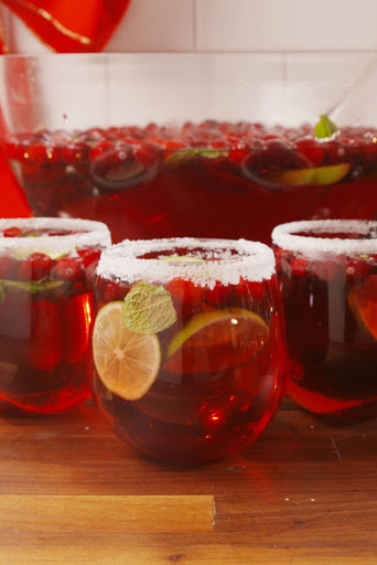 Wet the rim of your glasses with a lime wedge and dip them in sugar until they're coated. Combine all other ingredients in a large punch bowl or dispenser, stir, and serve cold!