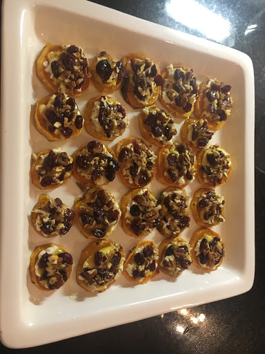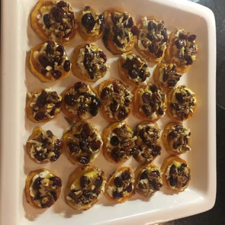 Baked sweet potato rounds topped with Boursin cheese, chopped cranberries and nuts with a drizzle of honey. Yum!