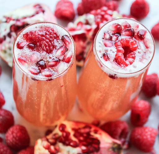 Mix in a shaker. Serve over ice. Garnish with pomegranate and raspberries