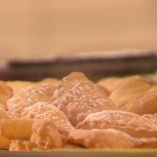 Fill each dough circle with a small spoonful of the chocolate-hazelnut spread. Dip your finger in tap water and spread on the edge of half the circle to help create a seal. Fold the dough over to create a crescent. Bake until golden, about 15 minutes. Cool, then sift the confectioners' sugar on top and serve.