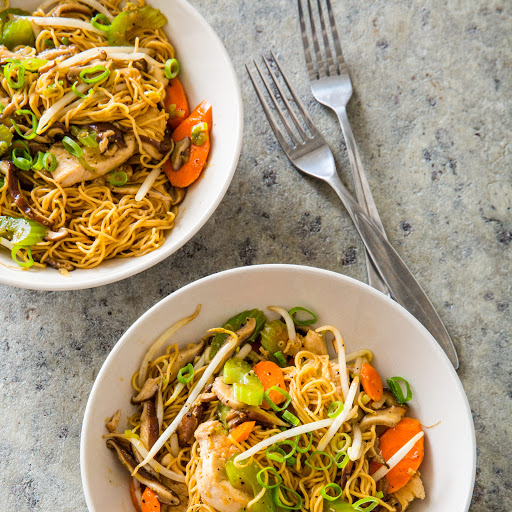 Four ounces of dried angel hair pasta can be substituted for the Chinese egg noodles, if desired. Kikkoman Soy Sauce won the test kitchen’s recent taste test of soy sauces. The best tool for grating ginger is a rasp-style grater.