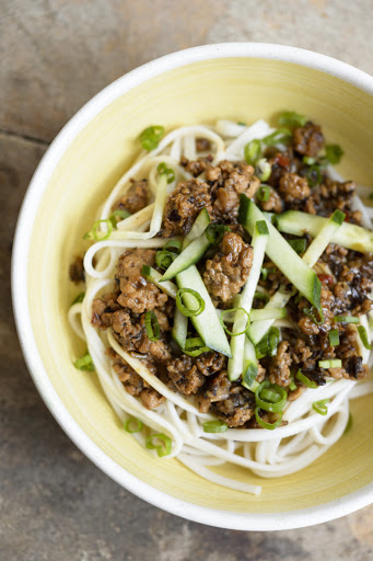 While the sauce simmers, season the cucumbers with the remaining 1 teaspoon of rice vinegar. Divide the noodles among serving bowls, then spoon the sauce over them. Top with sliced scallion greens and cucumber.