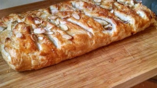 Spoon 1/3 of the filling along the length of the rectangle's uncut center. Alternating from one side of the dough to the other, fold each 1/2 inch wide strip towards the center, crisscrossing the filling in a braid-like fashion.