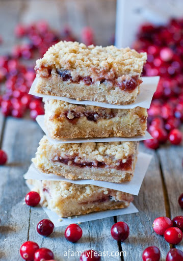 When the crust is done baking, remove from the oven and pour the cream cheese mixture evenly over the crust. Then spoon the cranberry mixture evenly over the cream cheese mixture, spreading gently with the back of a spoon so that it is evenly coated. Then sprinkle the reserved oatmeal crumbs over the top of the cranberry mixture.